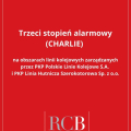 CHARLIE na wybranych liniach kolejowych. Będzie obowiązywać do 28 lutego 2026 roku, do godz. 23.59, na obszarach linii kolejowych zarządzanych przez PK Polskie Linie Kolejowe S.A. oraz PKP Linia Hutnicza Szerokotorowa Sp. z o.o. Jest to jeden z czterech stopni gotowości służb państwowych.